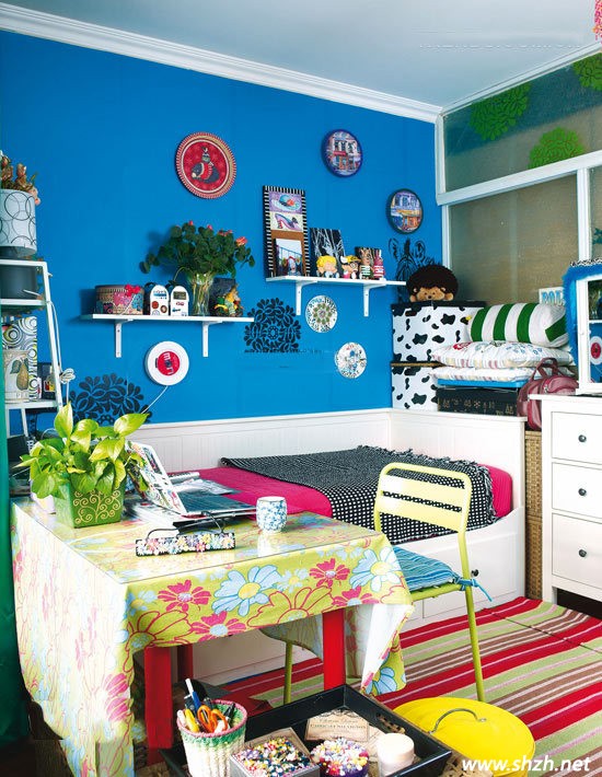 一張簡小幽雅的沙發(fā)床,潔白的沙發(fā)上搭配鮮艷的沙發(fā)墊,加上整個深藍(lán)色的背景墻,整體會讓狹小的空間很亮麗略帶一點奢華之感,而且層次也很鮮明。墻上,沙發(fā)周圍,桌子上各式有著各樣色彩艷麗的布藝裝飾和帶有民族特色裝飾物點綴,讓整個空間都活躍起來,別是一番風(fēng)情。
