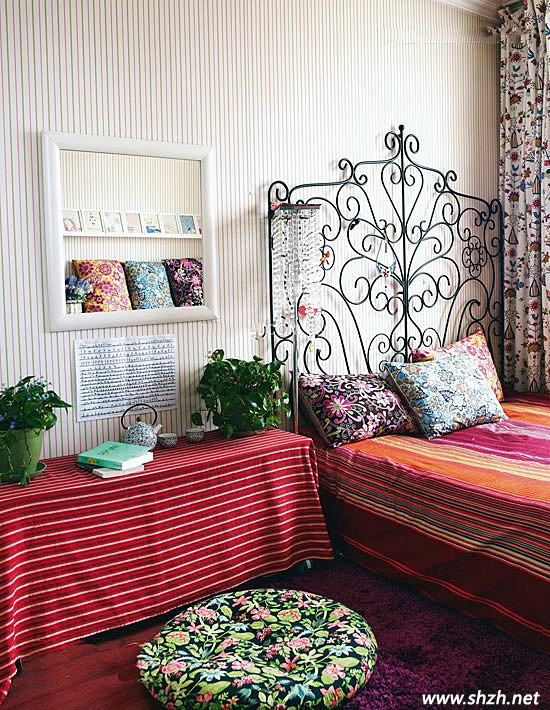 最后看看小臥室的風(fēng)情吧,藤條形狀的銅藝床頭,床上,地板,床頭柜的顏色都控制在深色系當(dāng)中,再用稍微淡的墻壁顏色調(diào)和整體感覺。不管墻壁,床單,還是床頭柜上的蓋布都是條紋相間。讓人眼花繚亂,既有現(xiàn)代感,又有雨林的天然感。