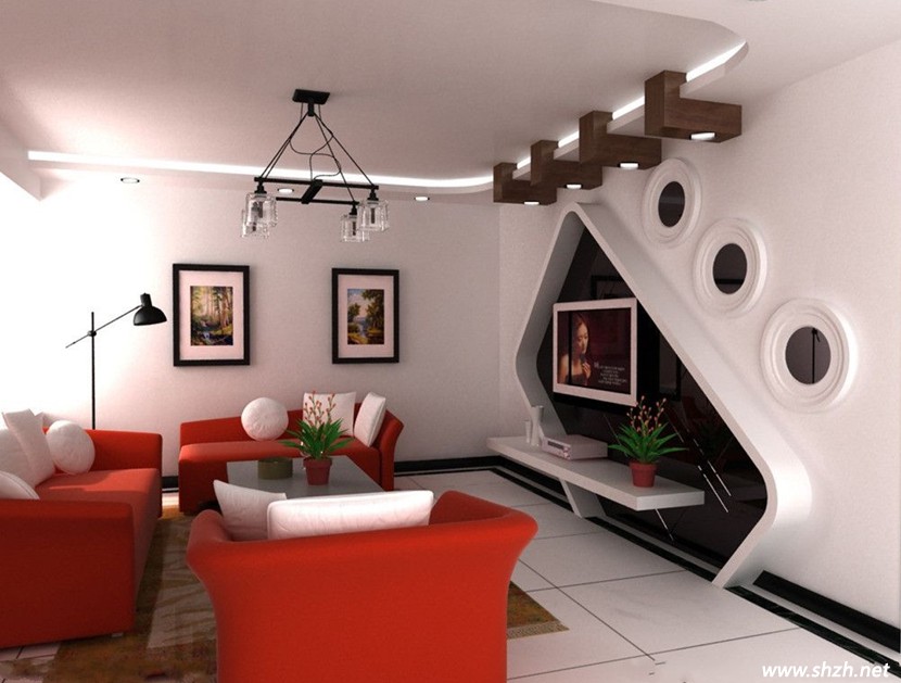 接著給你看的3D電視背景墻比較簡(jiǎn)單用凸凹、參差不齊的大理石磚面來(lái)展現(xiàn)3D的效果。凸出來(lái)的用作擺放照片的地方,凹下去的用作壁柜,用幾種不同顏色裝飾,更有3D的效果。頭頂上螺線狀的吊頂讓室內(nèi)更富有空間感。