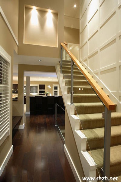 現(xiàn)代簡約的裝修風(fēng)格中,純色尤其灰色系的地毯最為常見,將地毯鋪滿整個(gè)樓梯不留一點(diǎn)空隙,地毯的紋理從高處一瀉千里,在視覺上就給人說不出的美感。柔軟的地毯配上深木色的木地板,層次鮮明,簡約時(shí)尚。