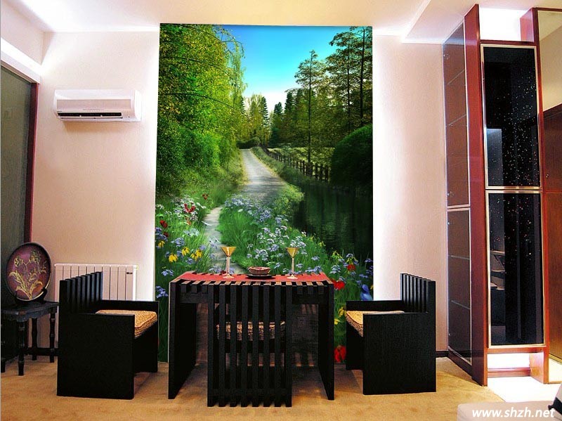 餐廳的背景墻,一般人都是掛上個(gè)性的圖畫(huà)來(lái)裝飾,但是換上噴繪墻紙呢,效果又是兩樣的吧,在無(wú)形中開(kāi)闊了餐廳的空間,綿延不斷的小道,鮮艷奪目的野花,綠色的樹(shù)木,都給餐廳增加實(shí)實(shí)在在的春色。