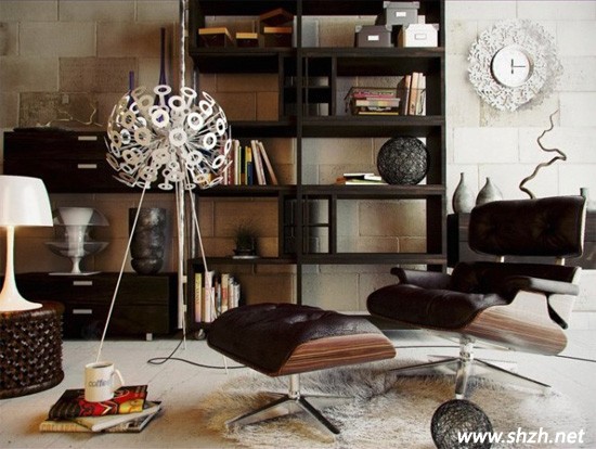在這個(gè)閱讀區(qū)里,座椅、書(shū)架、茶幾,都是深褐色,這樣的裝修效果適合為閱歷較豐富的主人。但空間里還有銀色時(shí)鐘、白色臺(tái)燈,使得空間“嚴(yán)肅”卻又時(shí)尚。