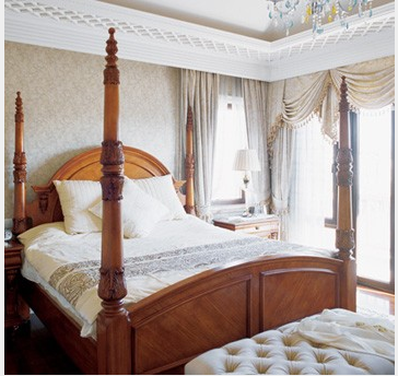 美式家具的好處之一就是尺度夠大。在這間臥室中,設(shè)計(jì)師為了讓眠者擁有充足的睡眠空間,刻意選擇了這種款式傳統(tǒng)的美式臥床。靜謐的環(huán)境是保證良好睡眠的前提,在保健醫(yī)生的建議下,地面設(shè)計(jì)采用了雙色拼花的原木地板,這樣的安排不僅協(xié)調(diào)了空間的視覺效果,也降低了步履行走所產(chǎn)生的分貝。