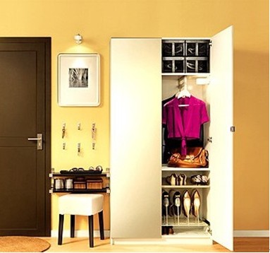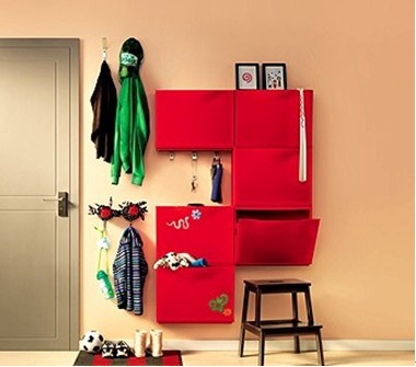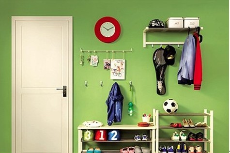 上方則專屬于是父母的儲物區(qū);另外,為了避免空間的浪費,在柜子中間空出的部分可以安裝一些小掛鉤,用來掛鑰匙或者雨傘等常用小物件。