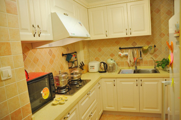 廚房的墻面磚為復(fù)古風(fēng),櫥柜亦以溫馨色調(diào)為主。