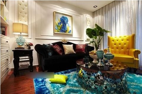 金黃色的沙發(fā),黑色的不銹鋼茶幾,特別的給力,視覺沖擊很強(qiáng)。