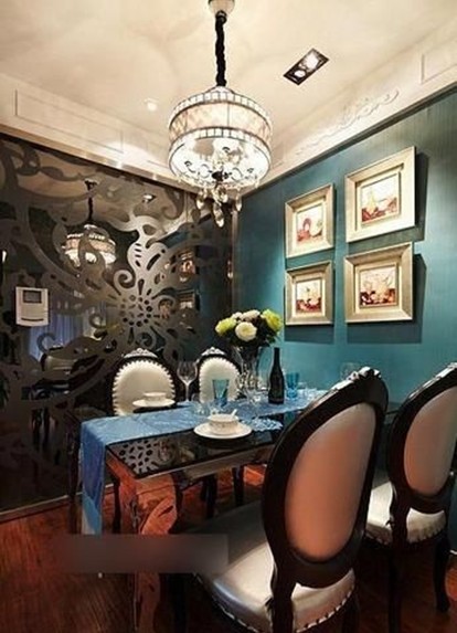 餐廳的吊燈是水晶的,這是不能錯過的,整面墻是帶點(diǎn)藍(lán)色的。