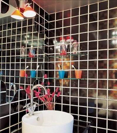 用顏色鮮艷、明快的小瓷磚組合,打破了衛(wèi)生間的傳統(tǒng)色調(diào),使空間變得靈動起來。衛(wèi)生間吊頂采用整面玻璃鑲嵌,增強了空間感與瓷磚和燈光相結(jié)合,置身其中使人有一種進(jìn)入夢幻世界的感覺。