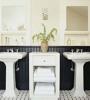 水盆上方的一對墻面柜可以用來存放牙膏、漱口水、阿司匹林等用品。經常會使用的用品,如肥皂、洗發(fā)沐浴用品、香水、化妝品等就存放在墻柜下方的置物格里。兩個水盆之間的櫥柜就用來存放毛巾和浴衣等。