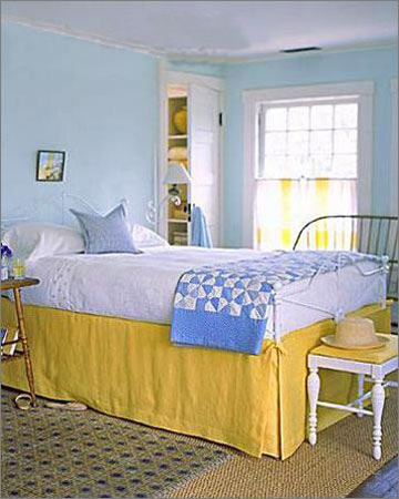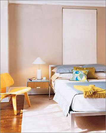 4.個空間給人的整體感覺是干凈而簡練,伴隨一些陽光的味道。溫暖陽光味道來自與暖黃色的床單,這與橘黃色條紋的窗簾相呼應(yīng)。而墻上那純凈到令人窒息的藍(lán),讓再煩躁的心情在此刻沉淀。