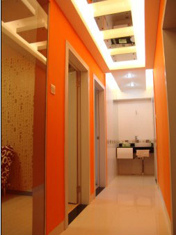 亮麗的橘色走廊的盡頭是一個(gè)公共洗手臺(tái)。