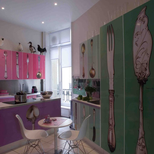 整個廚房用的都是宜家的產(chǎn)品,進(jìn)行了磁化處理,可以讓這些帶磁的家具合在一起,或者“交換場地”,很有特色。吊柜門和墻上巨大的餐具圖案,靈感來自老祖母傳下來的銀質(zhì)餐具。
