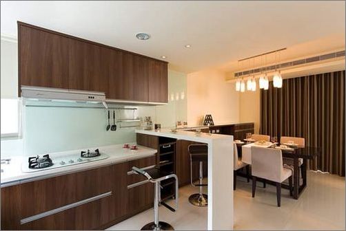 房子空間小時,廚房做成全開放式的可以使空間顯得大一些,別墅正相反。然而一樓餐廳、廚房的位置緊鄰客廳,如果做成開放式廚房,則很容易弄得客廳內都是油煙??扇绻褟N房做成正常面積全封閉式的則會使客廳顯得很悶;而把廚房做得很小,雖能夠保證客廳通透和無煙,可餐廳空間又會變得很空洞,所以最好的辦法就是把廚房做成半封閉的。