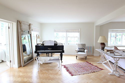 在沙發(fā)的后背不再是通常的背景墻,取而代之的是一架鋼琴和一面大鏡子,有著藝術的味道。這樣的無隔斷設計顯得整個空間大氣很多。
