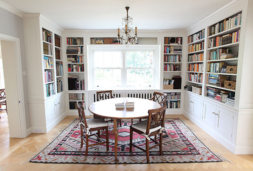 這里可謂是閱覽室了,類似于餐桌的書桌圍繞著木椅,原木的座椅與色調鮮艷的地毯搭配,說不上什么風格的搭配,看上去卻很舒適,完美。四周則是琳瑯滿目的書籍。