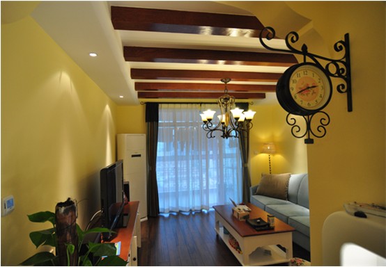 空間大背景是米黃色的,家具的選擇選用了偏白色、淡色的木質(zhì)家具。而鐵藝的燈飾、吊鐘則具有民族、復(fù)古風(fēng)特色。不大的空間營造出舒適的居家氛圍,暖洋洋的光線提升了家庭溫馨感。