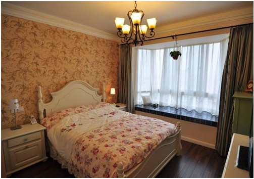 臥室布置很溫馨,色彩淡雅,格調(diào)清新。紗質(zhì)的窗簾,風(fēng)吹起的時候,輕飄飄的嫵媚。鐵藝的臥室吊燈,高雅感覺呼之欲出。碎花的床品與白色床架完美搭配,讓人感受到了清新明快的氣息。