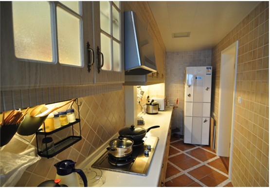廚房射燈設(shè)計的比較人性化,每個使用空間處都安裝了射燈,做到將方便帶到每個操作臺旁。展柜的射燈光線由每格頂處打出,使展柜變得立體而有了重心,并且增強(qiáng)了時尚感。