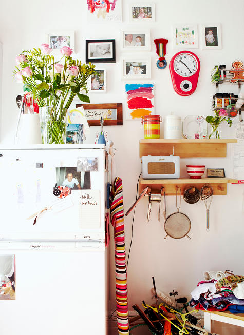 廚房的空間不夠,冰箱擺在客廳里,這一面墻既是裝飾用也是收納空間,正在廚房的旁邊生活也很方便。