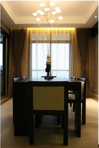 沙曼與窗簾的結(jié)合,給餐廳營造了一絲的浪漫,顏色的運用也呼應了整個色調(diào)。燭臺的運用給端正硬朗的餐桌帶來一絲柔和之氣。