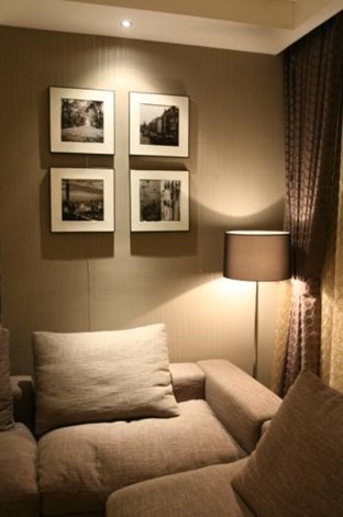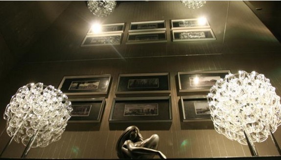 在燈光的映襯下,整個空間的顏色都變得渾然一體,這時,必須要有東西來喚醒我們的雙眼。照片墻的運用整個空間的一大特色之一,白色的框架,放上復古懷舊的風景照,時尚又不失檔次。