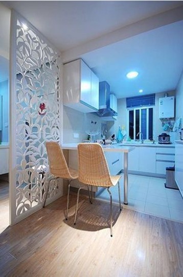 簡約的風(fēng)格在廚房空間里顯得淋漓盡致,清藍(lán)色的燈光將空間打造的清新典雅。廚房里設(shè)有一個吧臺,不想做大餐的晚上可以在這里將就一下,也不用再特地收拾一下餐桌了。進(jìn)入廚房的這個別致的鏤空隔斷,又為空間里增加一些時尚氣息。