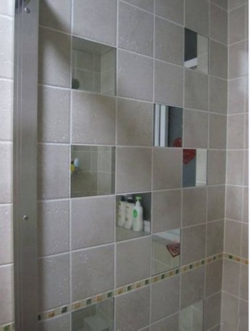 這是衛(wèi)生間淋浴房的一面墻,從墻面上摻插的鏡子墻面來看,收納儲物空間皆是有續(xù)的。