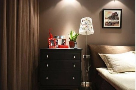 窗簾亦是咖啡色系的,這個床頭落地抬燈秀氣別致。床頭柜則是較為實(shí)用的選擇,可以作為儲物空間,一些珍貴物品或易醉物品皆可放在這個固定的場所。