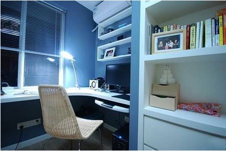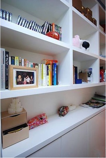 書房里做了一面書架墻,雖然這樣使本來就空間不大的書房更顯得小一些,不過這個收納空間非常實(shí)用,而且易清理,保存功能也很好。下排柜是一層柜門的,除了書本還可收納其它物品。