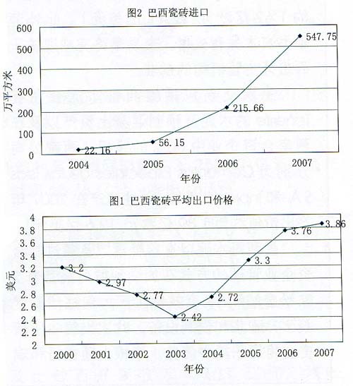巴西瓷磚出口在2000年至2004年之間呈增長趨勢,從5670萬平方米增長到了1.26億平方米.之后出現(xiàn)下降趨勢,2007年降到了1.02億平方米。前期得到增長是因?yàn)椤鞍臀鞲煞ā碑a(chǎn)品的質(zhì)量與濕法產(chǎn)品非常接近,加上合適的利率,于是生產(chǎn)商紛紛尋找機(jī)會擴(kuò)大市場。然而,隨著利率的變化以及國內(nèi)市場的增長,生產(chǎn)商們改變了策略,大大減少了出口。2C104年之后,雖然出口量下降.但是出口額反而增加.這主要是由于出口產(chǎn)品中價格較高的產(chǎn)品所占比重增加.平均出口價格上漲(見圖1)。
