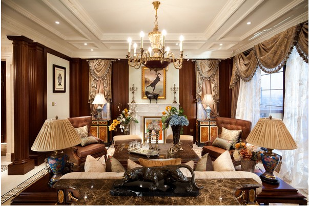 客廳里融入了歐式的裝修風格,大墻面柱子等方面又能看到東方中式文化的影子。