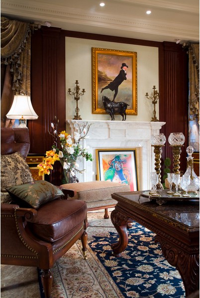 硬朗的皮革、壁爐的石材讓這個空間顯得大氣婉約。而碎花的地毯又不會讓空間顯得過于拘謹和莊重,而壁爐上方的滑稽圖片又會起居室里增添一比輕松愉悅的氣氛。