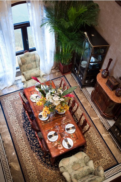 從頂上看這個餐廳發(fā)現(xiàn)它是極具儀式感的,這個七米挑高的餐廳中,擁有諾大的馬蹄形的拱窗上以及它整面墻掛的窗簾。這樣無形中增強了空間大挑高的視覺效果。雖然中式的餐桌椅,但是無論是餐桌椅的擺設還是餐具的擺放位置都是濃濃文藝復興時期的歐洲式的優(yōu)雅,這些細微的小細節(jié)無形中為空間帶來無限的靈性與貴氣。