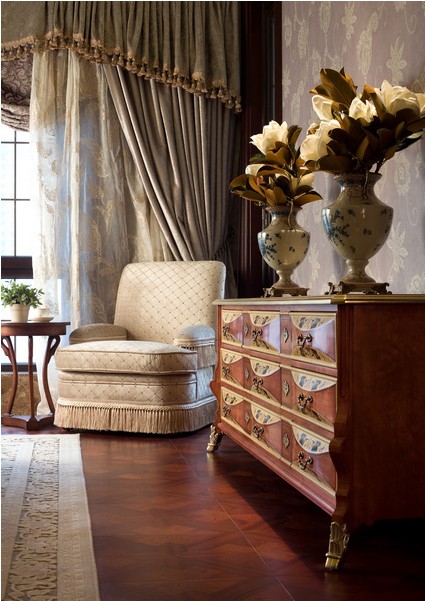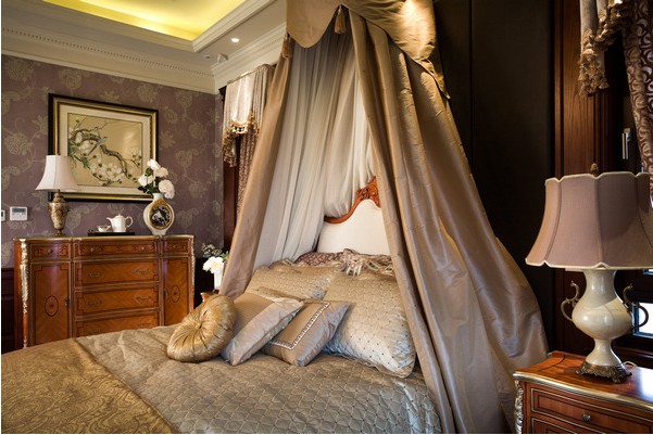 臥室里從細節(jié)到主調都是濃濃的歐式貴族風情。洛可可時期對女性文化的推崇在這里得到了充分的展現(xiàn)。