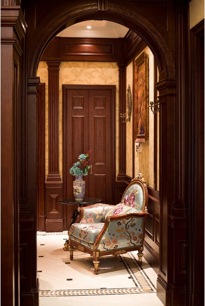 進入玄關,如同進入18世紀歐洲的古堡里,精致到完美的巴洛克玄關臺它的完美展現(xiàn)是對整套別墅風格的一個完美提煉。面在鏡子邊框的細節(jié)上我們又能看到中國青花,采用了中瓷西做的手法,藍白相間的青花瓷,其清秀的姿態(tài)讓空間變得含蓄起來。