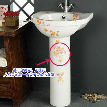 面盆 設(shè)計(jì)打破常規(guī),大膽的在盆體和立柱上添加手繪桃花,為原本略顯呆板的純白色注入了生機(jī)。盛開(kāi)的桃花無(wú)疑會(huì)成為衛(wèi)浴 間里的亮點(diǎn),天天在朵朵桃花的陪伴下,自然天天好心情~~