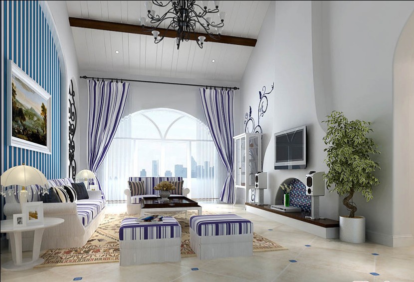藍(lán)白條紋相間的家居用品在白泥灰墻的裝飾下變得純美。巨大的拱形門窗讓整個(gè)客廳顯得光線極好,藍(lán)白相間的色彩亦空間變得張力十足,無(wú)形中客廳在無(wú)限放大。