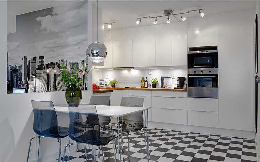 半開放式的廚房里,小餐廳就在這里,餐桌上的綠色在潔凈的空間里更顯得清新浪漫。類似于國(guó)際象棋盤一樣的地磚卻又能給我們帶來濃濃的懷舊情結(jié)。在不相配的元素搭配下卻能成就一個(gè)和諧的空間,這就是現(xiàn)代簡(jiǎn)約的魅力。