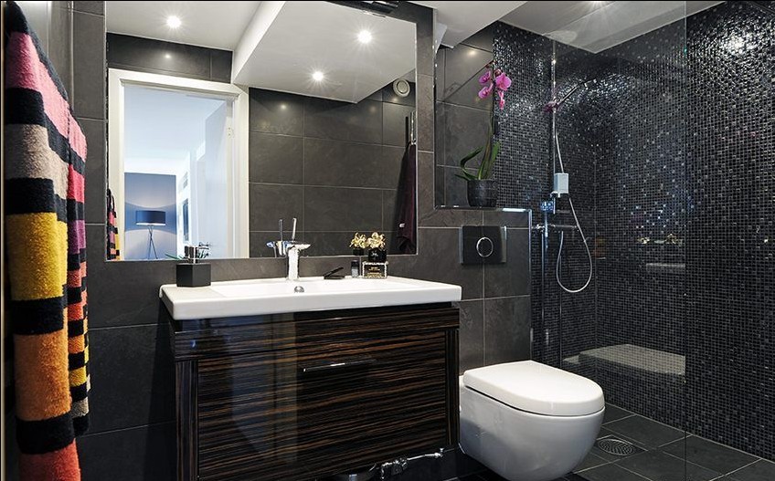 衛(wèi)生間里的色彩雖然是深色系當(dāng)?shù)溃撬幕疑拇┎骞獾姆瓷涠加辛瞬灰粯拥男Ч?/p>