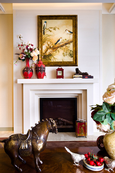 這個(gè)是客廳的全景,全家人共用的客廳。沒有改變房型的情況下,這個(gè)客廳是長方形的,空間夠大,歐式壁爐是為裝飾品亦是一種文化的承認(rèn)。中式文化的影子遍及整個(gè)客廳,小到燈具花瓶擺設(shè)。