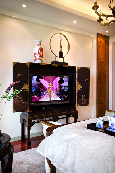 臥室里的這個(gè)類似裝飾柜,其實(shí)打開,它是放置電視機(jī)的地方,別致吧。