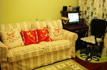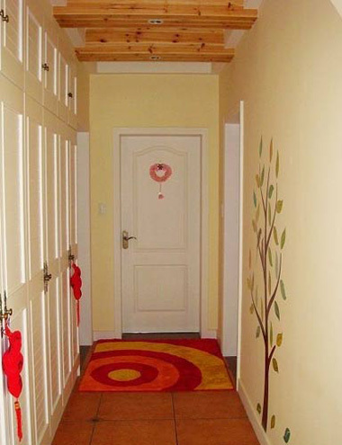 玄關(guān)處進門右手邊是一排排柜子,很好很強大的收納作用。左邊的墻面繪著春天的圖樣,一樣四季都可以是春天?;榉康纳蕪男P(guān)處看大概只有柜門上那喜慶的掛件才能看到。