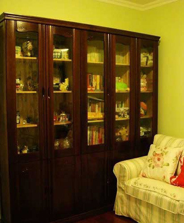 田園風(fēng)味沙發(fā)的另一端是一排書柜,這不是我們常見的格子間形式,而式較為老式的帶門書柜。這是之前就有的,再裝修時搬過來的,它非常的實用而且特別易于清潔打掃,MM不愿意丟掉的原因。