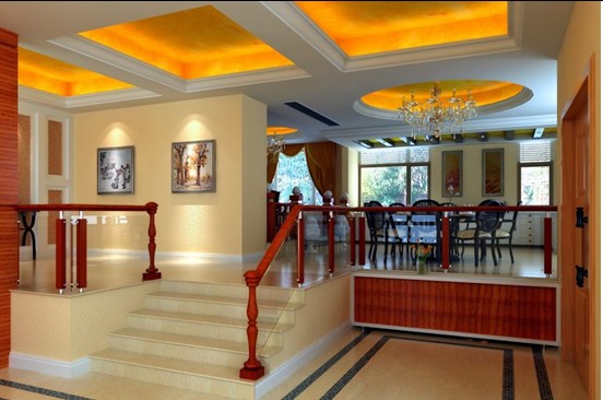 客廳是交友娛樂(lè)中心,影視墻采用兩邊櫻桃木飾面板內(nèi)藏光管,中間是金花米黃大理石。再在客廳里放上兩株植物,顯得生機(jī)不少??蛷d里的窗戶窗套都采用波浪板做的造型??蛷d墻面色彩為米黃色,本別墅中客廳采用液晶電視,安裝高度為1.3m左右。正好是坐在沙發(fā)上人的視線高度。8人組的真皮沙發(fā),既大方又有氣派。地面選擇了米黃色大理石。