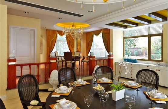 餐區(qū)整體效果色調(diào)以暖色為主,天花造型里的頂面墻上貼金色的墻紙,石膏板上粘貼石膏線條,離窗邊1.5米的地方有一條梁,設(shè)計(jì)師就把天花吊得與梁同高,然后在梁與窗中的地方用15*20公分的的假梁用黑胡桃飾面板包一圈。并在梁的側(cè)面走一圈石膏線。窗下做了一排餐邊柜并在柜中按上洗手盆,這樣做我覺(jué)得挺人性化的,吃飯前后都可以在這洗手,干凈又衛(wèi)生。餐體的圓型吊頂配上圓桌更顯大氣。