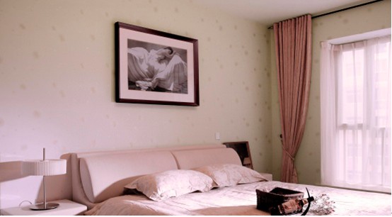 墻上大幅照片很好體現(xiàn)床寢文化意境,淡雅細(xì)碎的圖案墻紙、粉紅色的床上用品、粉紅色窗紗、桃紅色的窗簾,體現(xiàn)主人細(xì)膩性格;