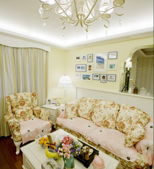 田園風(fēng)格的客廳,墻面上是淡雅的淡黃色墻面墻漆,溫馨感由面而來。沙發(fā)的碎花與淡淡的粉色墊布映稱著墻面,空間的層次感突顯。