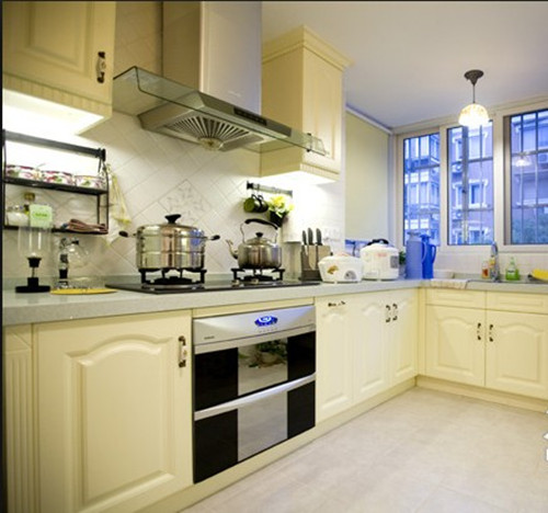 這個(gè)廚房面積不錯(cuò)的,俗話說巧婦也是需要練成的。L型的廚柜使廚房更顯寬大,藍(lán)色的有機(jī)玻璃透著光潔的光,廚房也顯得干凈明亮許多。