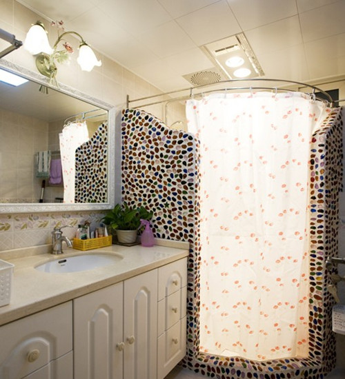 衛(wèi)生間里其它地方都是常見的,唯有這個(gè)淋浴房,半開放式的馬賽克拼接,既有童趣亦會增加視覺美感。