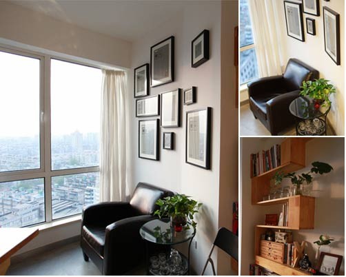 書房一側(cè)的休息處,大大的落地窗,開闊的視野。簡潔的黑色單人沙發(fā)以及背景墻面的照片裝飾,體現(xiàn)出簡約藝術(shù)的美感。原木色的純實(shí)木書架,放置的書籍與藝術(shù)裝飾并存。清新的植物盆栽,簡約清新亮麗美家。